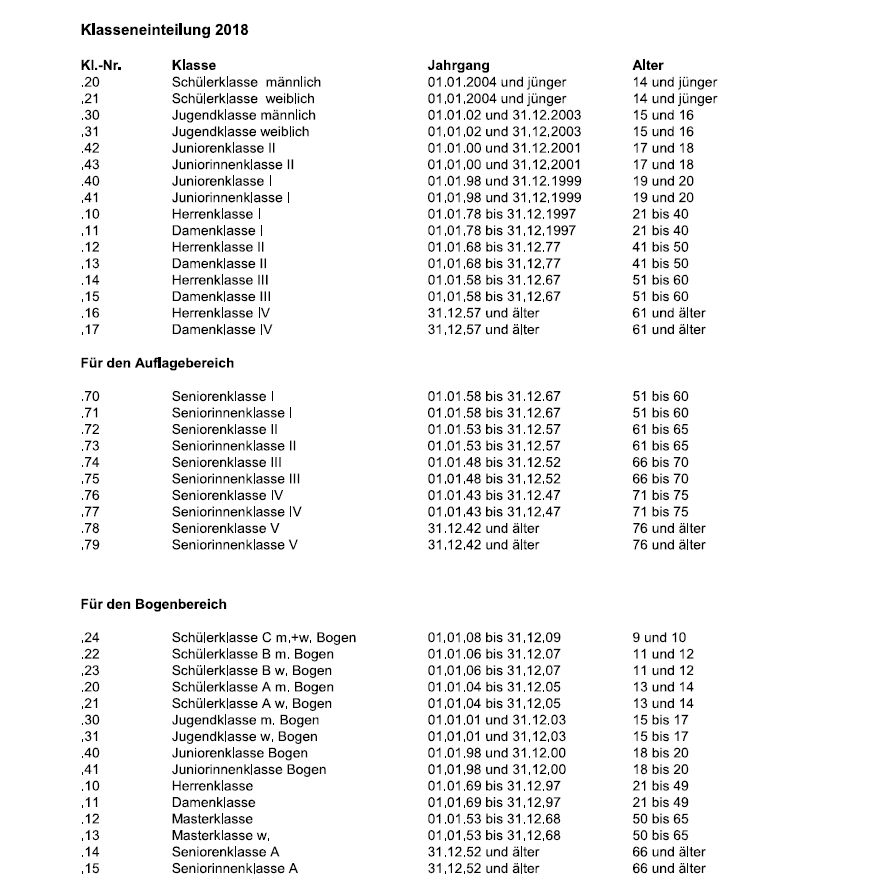 Zum Sportjahr 2018 wurde die Klasseneinteilung durch den Deutschen Schützenbund geändert. So gelten die Seniorenklassen nur noch für Auflagewettbewerbe und für nicht-auflage Wettbewerbe wurde die Herren- bzw. Damenklasse I-IV eingeführt. Während bei den Kugeldisziplinen die Altersklasse komplett gestrichen wurde, wurde sie für die Bogendisziplinen in Masterklasse umbenannt. Eine Übersicht über alle Klassen findet ihr hier.